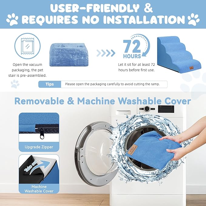 - No Assembly Required & Easy to Clean: When you open the packaging, the pet stair is already assembled. Before the first use, it should be left standing for at least 48-72 hours for the foam to fully expand. NOTE!! Open the packaging carefully to avoid cutting the stair! The outer cover can be removed for cleaning and supports machine washing or hand washing. Please note that the inner foam is not washable.