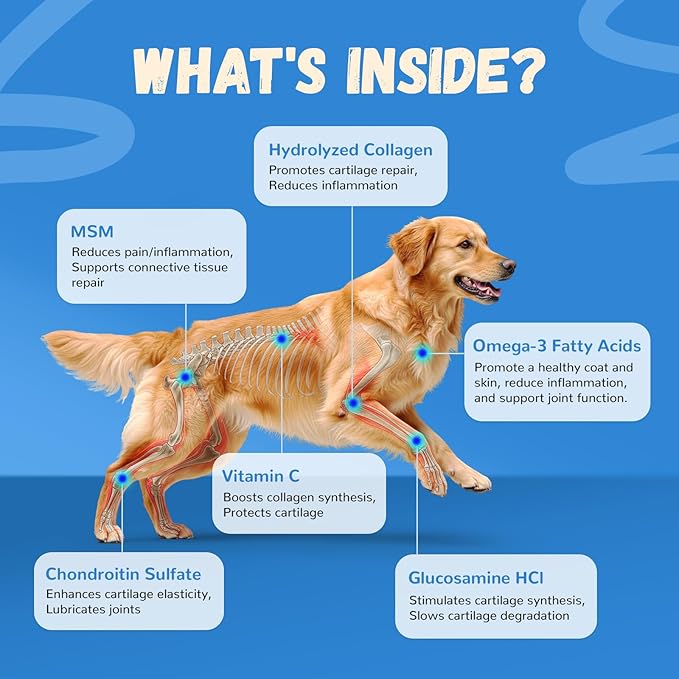 - ENHANCED MOBILITY & FLEXIBILITY - Contains Chondroitin Sulfate & Hydrolyzed Collagen to support cartilage health, promote joint lubrication, and help maintain flexibility for active dogs.