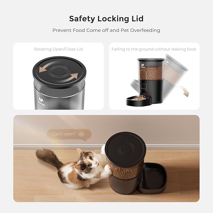 - SEALED SPACE WITH SECURE LOCKING LID: Does your cat often knock things over and throw them everywhere? The auto cat feeder's safety clasp locks the food storage bin tightly so your cat can't open it. Meanwhile, the 3L sealed dry food bucket keeps pet food crispy and delicious and away from moisture