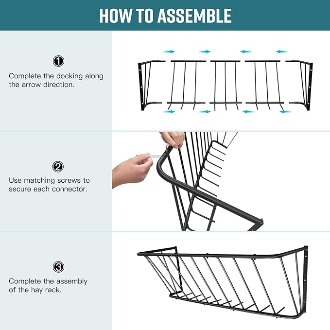 - Easy installation: Our Livestock hay rack consists of 5 pieces,secured by butt steel pipes and screws,and can be easily assembled by one person.We offer two different kinds of screws that you can easily install on boards and walls, just make sure that the height of the installation is enough for your animals to eat the hay.