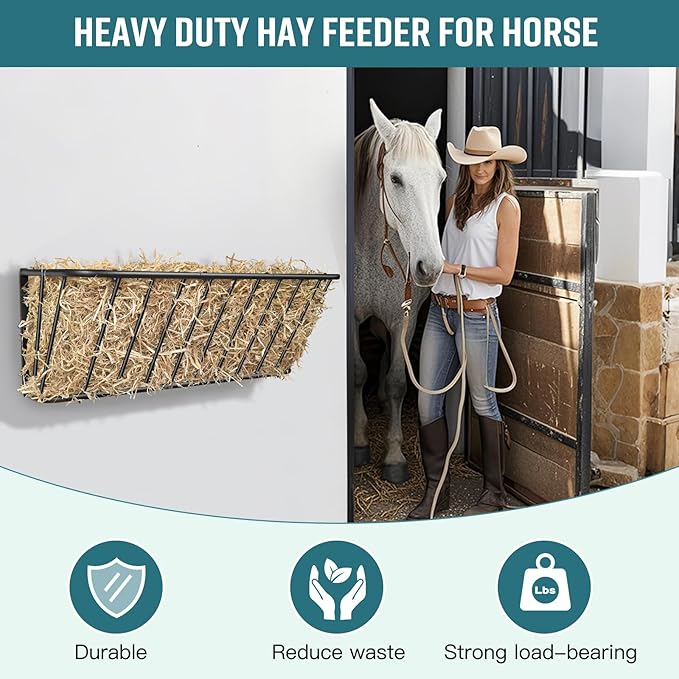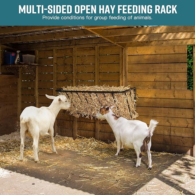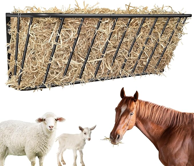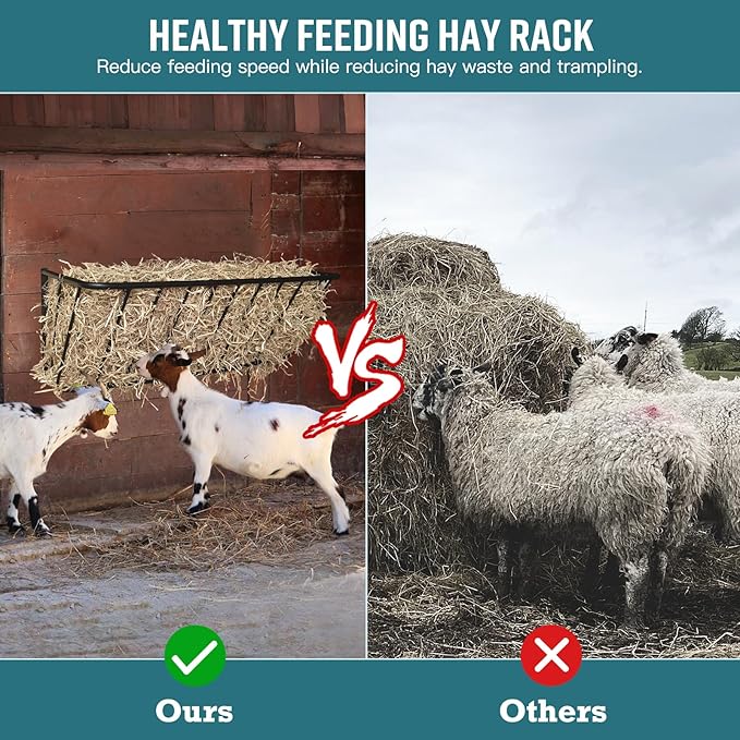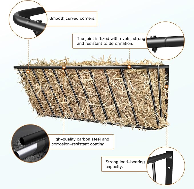 - Sleek curved design: Designed to provide a safe feeding environment away from the ground for animals,our wall-mounted hay rack is designed with rounded corners profile to prevent injury to your animals during feeding.The perfect sloping curve on the outside of the hay feeder rack allows the stuffed hay to easily slide down to the bottom as it decreases,allowing animals to reach the hay and providing you with a comfortable feeding experience.