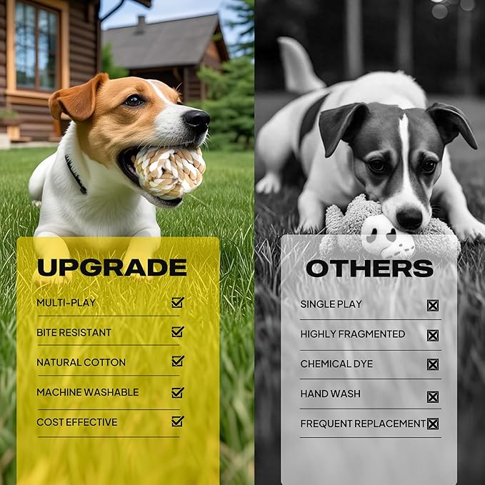 - 【4 PACK】 1 Cotton Rope Ball, 2 rope doggy toys with tug, 1 rope toy with ball. Good choice for Tug of War, Toss and Fetch Games, and Teething of your puppy. Works for aggressive chewers and teething puppies(NOT EXTREMELY aggressive)