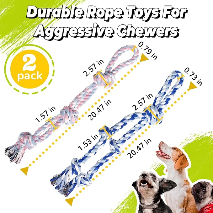 - 20-Inch for Medium/Large Dogs: 2-pack set offers great value for alternating use or multi-dog play. 20-inch length with reinforced knots is ideal for medium/large dogs and aggressive chewers, designed to withstand intense tugging and chewing while reducing choking hazards for smaller breeds