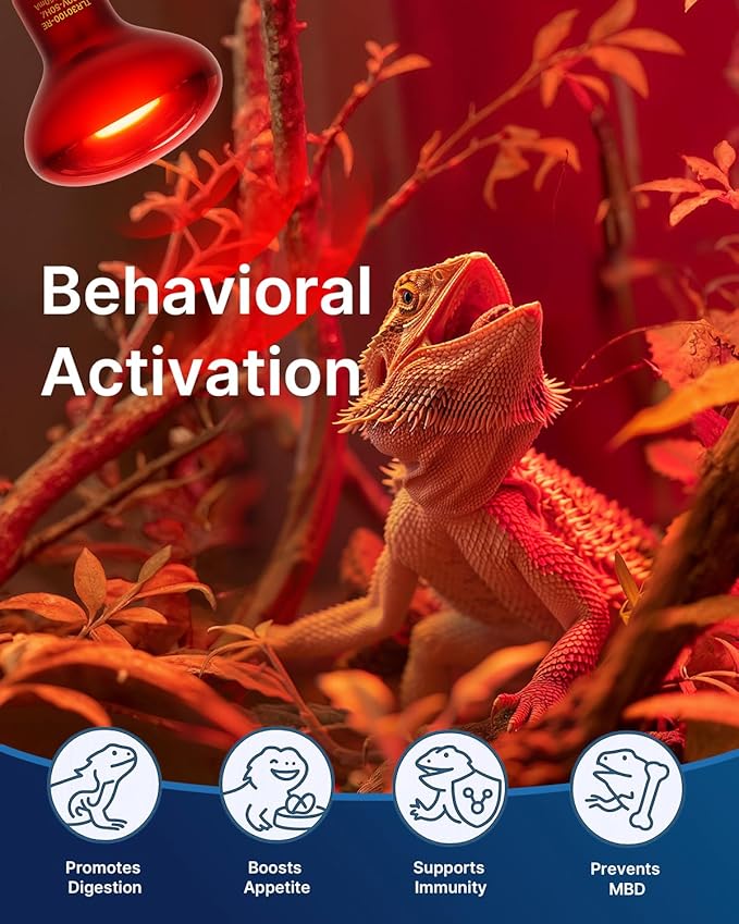 - Infrared Basking Spot Lamp: The reptile heating bulb uses infrared light to increase the overall temperature of the terrarium, which helps promote the appetite, reproduction, and natural behavior of reptiles, effectively improving their immunity and healthy growth