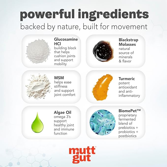 - ๐๐จ๐ญ๐๐ฅ ๐๐จ๐ข๐ง๐ญ & ๐๐จ๐๐ข๐ฅ๐ข๐ญ๐ฒ ๐๐ฎ๐ฉ๐ฉ๐จ๐ซ๐ญ: MuttGut Mobility Chews combine Glucosamine HCl, MSM, and Omega-3-rich Algae Oil Powder to support cartilage development, joint cushioning, and flexibility, helping your dog move with ease