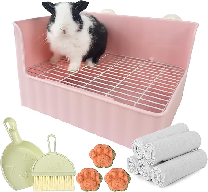 - Package Include: For the same price, you'll get 10pcs in total! 1*rabbit litter box. 1*plastic dustpan and broom set, is perfect for sweeping in and around the small animal litter box. 3*random grass cakes, are good for chewing and playing to add more fun to your pet's life. And 5 pcs rabbit cage liners,absorbent liners to make clean up even easier