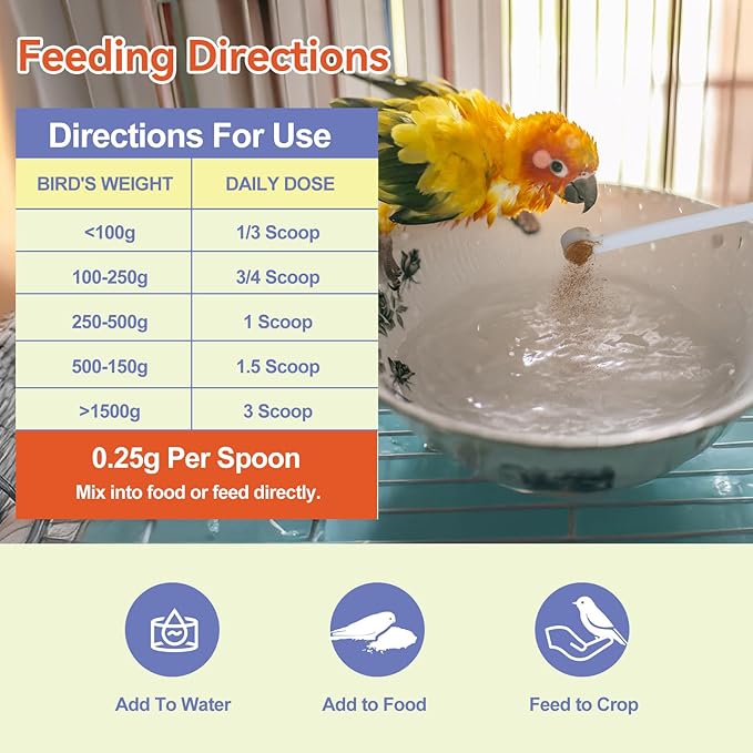 - Tasty Dietary Support: Whether your bird is a picky eater or not, this powder is easy to feed: it can be mixed into drinking water, soft food or sprinkled directly on daily food to smoothly complete daily nutritional supplement. The bottle comes with a feeding spoon, each spoon is 0.25 grams, and it can be accurately fed according to body weight.