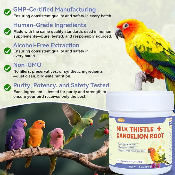 - Liver Detox for Birds: Enriched with Milk Thistle Extract (80% Silymarin) and Dandelion Root Extract (4:1 concentrate), this herbal supplement provides daily liver support for birds and helps treat acute and long-term liver damage in birds.