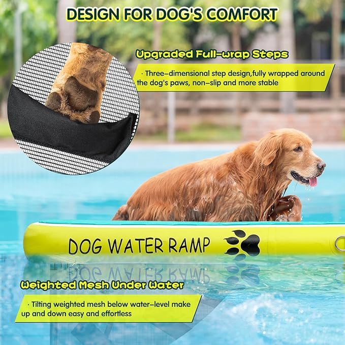 - EASIER & SAFER WATER ACCESS: Featuring an underwater tilting weighted net, the dog pool ramp creates a secure incline for your pet to exit pools, lakes, or boats effortlessly.The 3D step design wraps around their paws, offering non-slip stability and extra safety.Say goodbye to slippery struggles