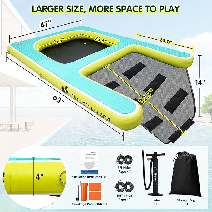 - SUITABLE FOR SMALL TO MEDIUM DOGS: Designed specifically for smaller breeds, the dog dock supports your pup’s water adventures with a secure dog water ramp and comfy floating raft. From playful pool dips to lake outings or boat trips, this 63" Lx 47" W ramp delivers safety, stability, and fun—making every splash a joy for your furry companion