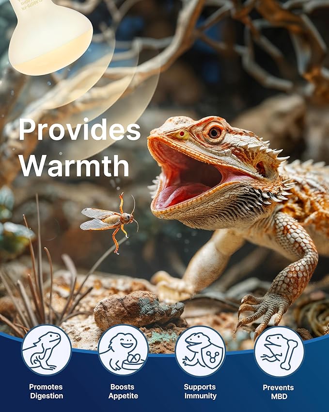 - Efficient Heating: Our reptile daylight heat bulb quickly and efficiently warms up reptile terrarium, creating a perfect basking spot for your pet. It ensures your reptile grows in a warm, healthy, and naturally comfortable environment