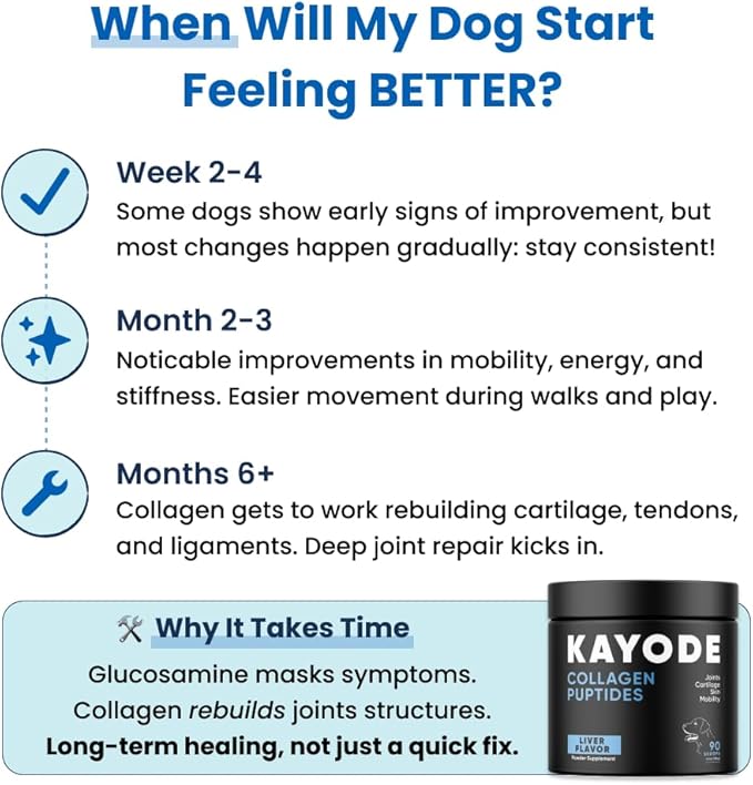 - Skin & Coat Health - The marine collagen helps keep your dog's skin moisturized, elastic, and healthy. In a few weeks you'll feel a softer, silky, and more petable coat for better cuddling time.