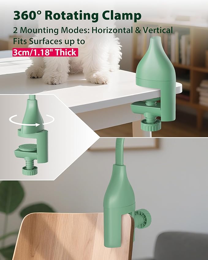 - Dual-Use Design: Wear It or Clip It: Enjoy ultimate flexibility with our 2-in-1 pet dryer. Wear it comfortably around your neck for hands-free grooming, or securely attach it to any table using the included clamp for stable, stationary drying.