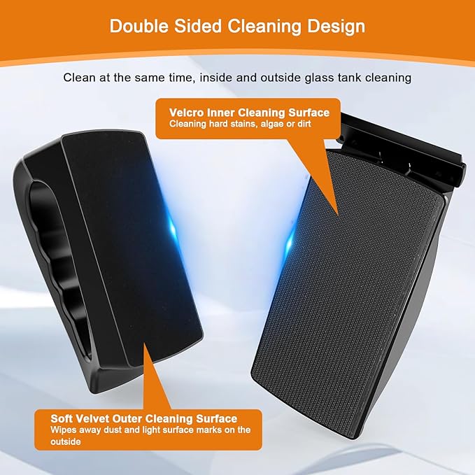 - Multi-function Glass Cleaner: Dual-sided design for interior and exterior tank maintenance. 1. Velcro inner cleaning surface: for glass surface care. 2. Soft velvet outer cleaning surface: for exterior surface care. 3. Upgraded plastic blade: suitable for glass and acrylic tanks.