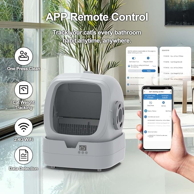 - ๐ฒ Smartphone Connectivity: Supports 2.4GHz Wi-Fi and Bluetooth for smooth connection with the companion app. Easily track your catโs weight, toilet duration, and litter box visits in real time.
