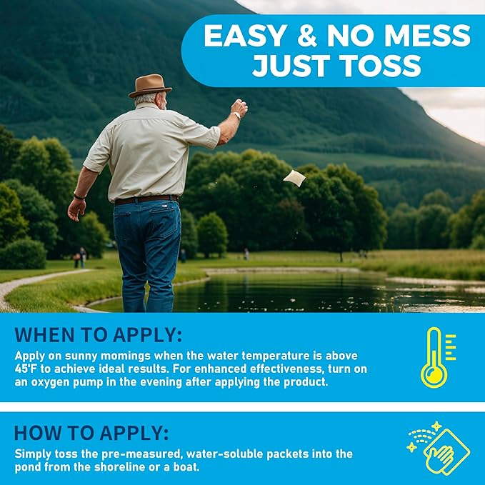 - Easy to Use: With water-soluble packaging, there’s no need for complicated measuring or mixing. Simply toss the bag into the pond and it starts working right away. It’s an effortless way to maintain water quality, saving you time and energy. Best results are achieved when the water temperature is above 45°F