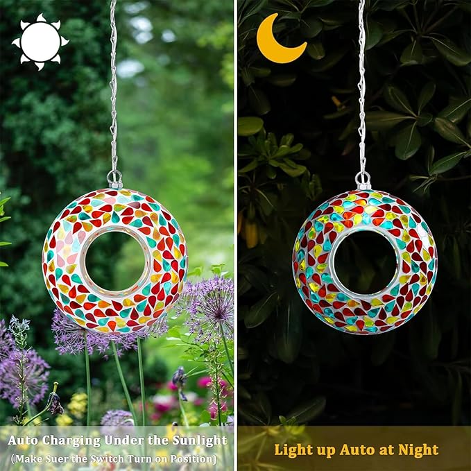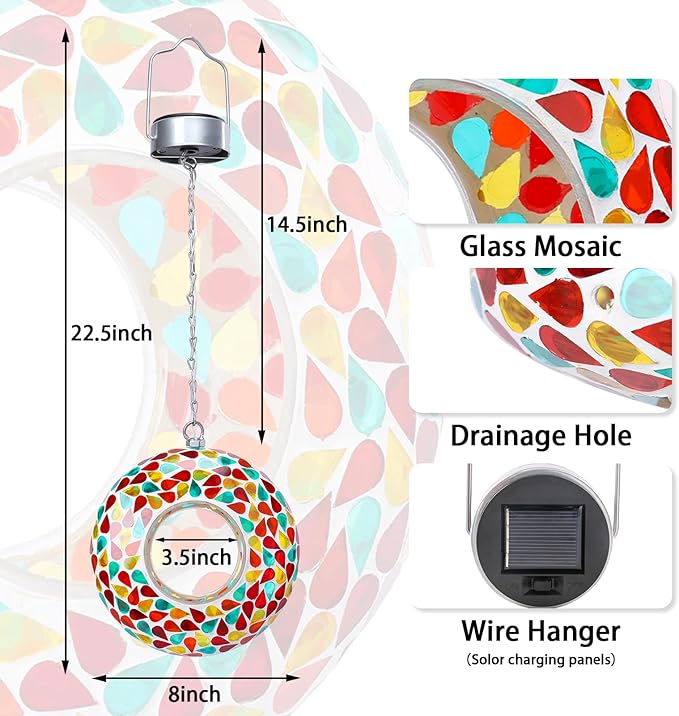 - Unique Mosaic Bird Feeder: Has a colorful mosaic glass design which reflects beautiful lights in the sun and attracts birds to feed, making your home and garden more lively.With new solar lights design to guide the birds to feed at night