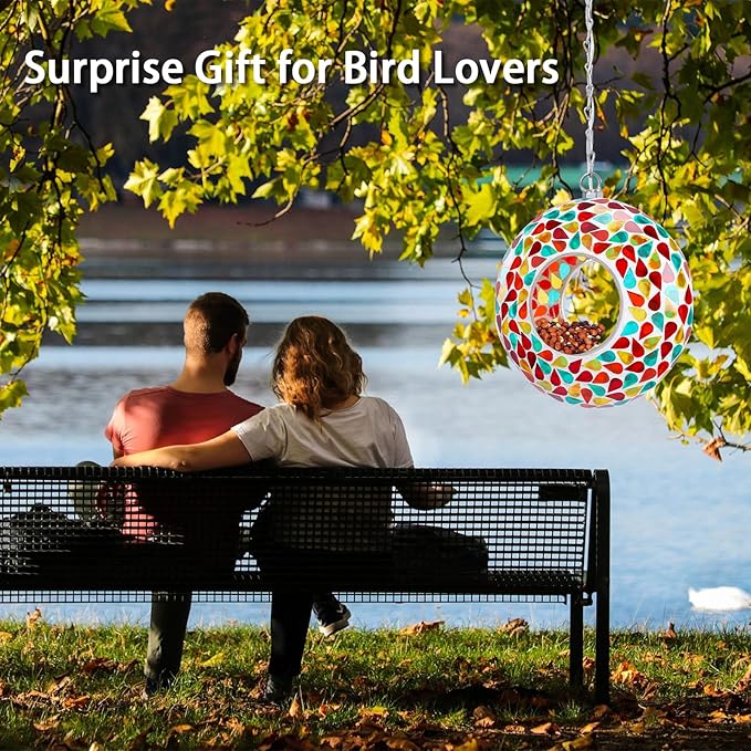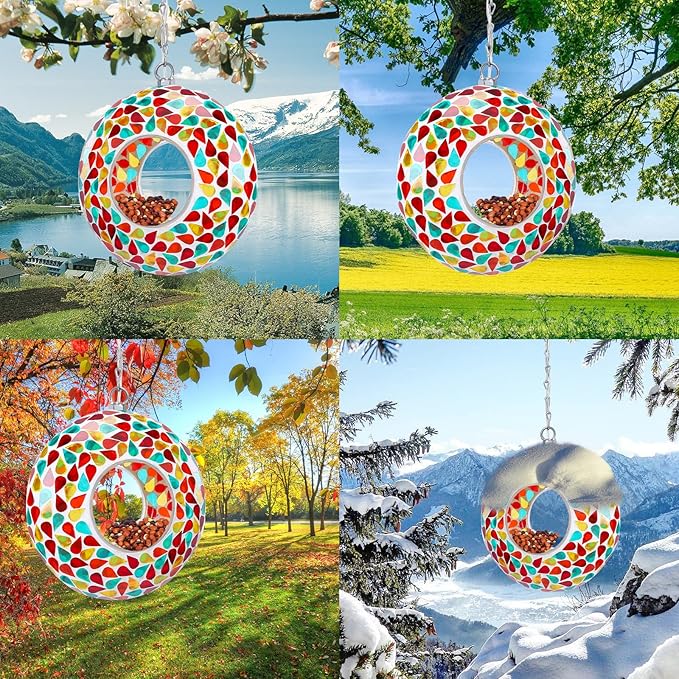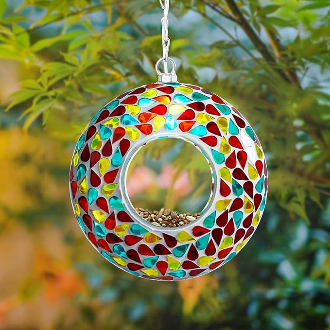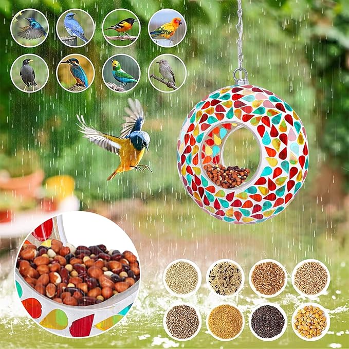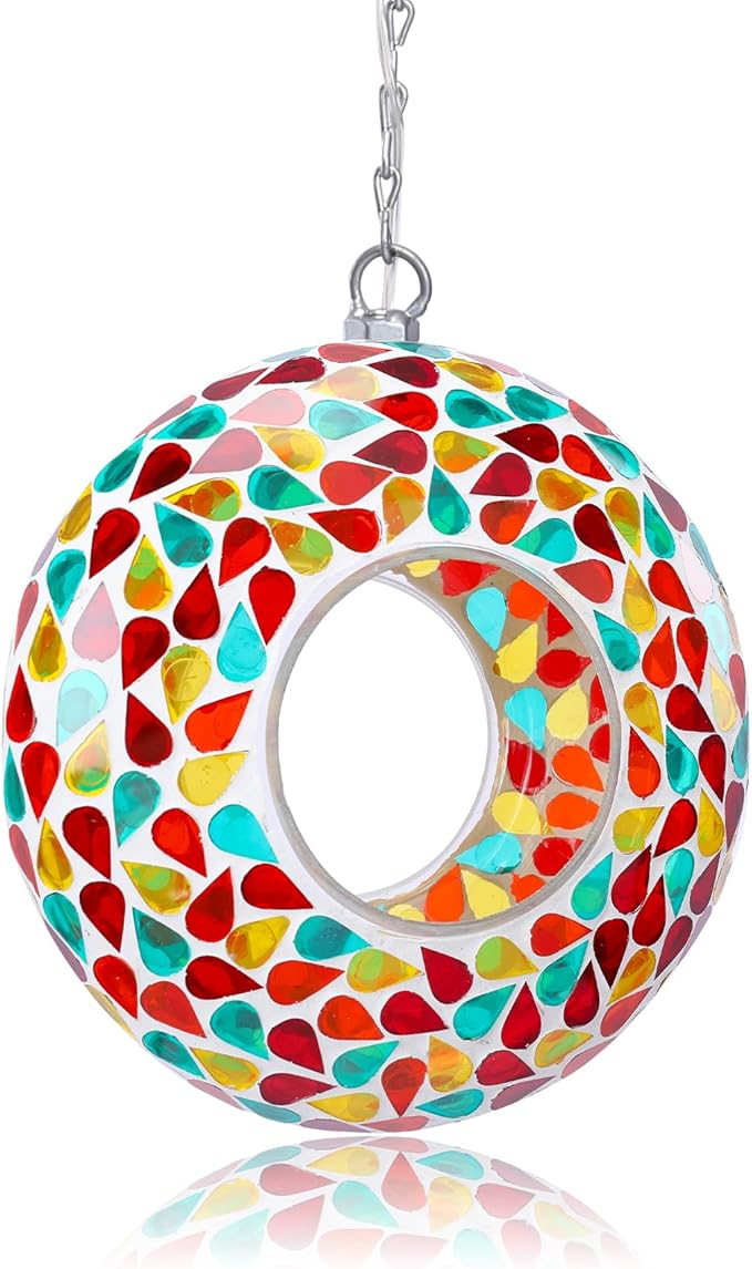 - Hanging Bird Feeder: Mosaic hang bird feeders for outdoors is made of strong mortar and glass. Birds can eat from the rim or hop inside during bad weather