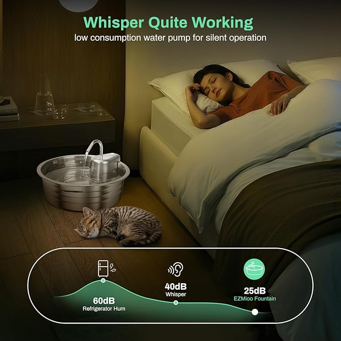 - ULTRA-SILENT PUMP & LOW CONSUPTION: The fountain pump is ultra silent when running, keep it below 25db, only the sound of water flow can be heard. Even if it runs at night, it will not affect you and your pet’s sleep