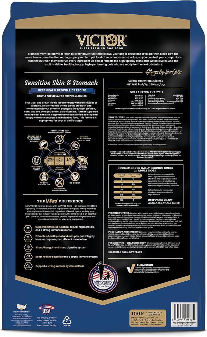 VICTOR Super Premium Dog Food — Sensitive Skin and Stomach — Beef Meal & Brown Rice Recipe Dry Kibble — Gluten Free, No Chicken, Ideal for Dogs with Allergies — Adult and Puppy Food, 5 lb