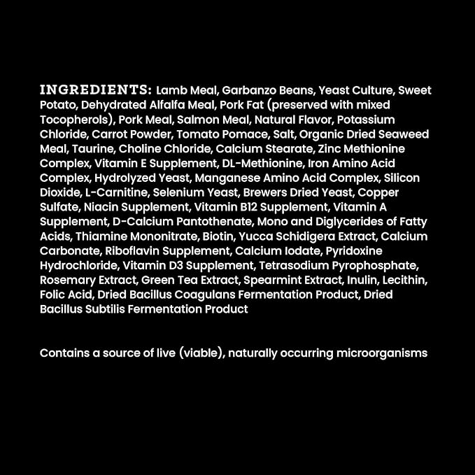 - QUALITY INGREDIENTS: High-quality lamb meal is the first ingredient in this nutrient dense recipe. With high amounts of animal protein, we proudly share the percentage of all protein sources on the front of our bag. The high-quality proteins in this recipe help build and maintain lean muscle, sustain energy and promote stamina for a full and healthy life.