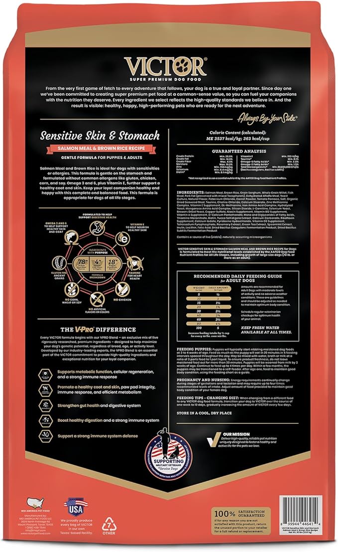 VICTOR Super Premium Dog Food — Sensitive Skin and Stomach — Salmon Meal & Brown Rice Recipe Dry Kibble — Gluten Free, No Chicken, Ideal for Dogs with Allergies — Adult and Puppy Food, 15 lb
