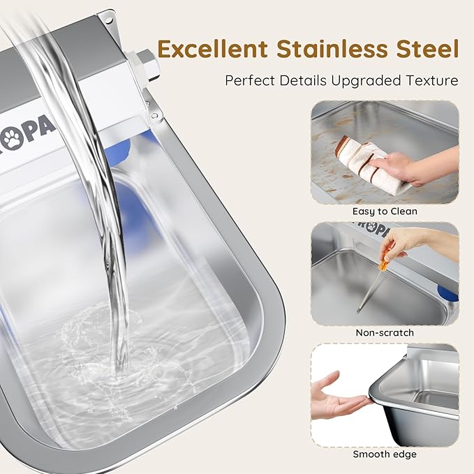- 【Pet-Safe Steel Bowl】PROPART's 316 stainless steel pet water bowl features a durable 3mm thick construction with mirror-polished surface (Ra≤0.4μm smoothness) for comfortable use. The weighted base provides stability during pet activities, while the scratch-resistant material allows for easy cleaning