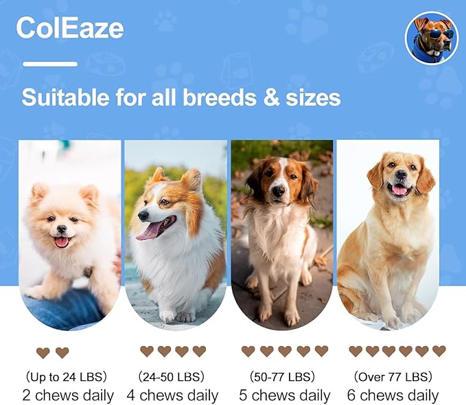 - All-Life-Stage Joint Care: Whether your furry friend is a playful puppy or a wise senior, our dog joint supplement offers age-appropriate support. Formulated with glucosamine chondroitin for dogs, it strengthens growing joints in young dogs and eases aging hips in older pups. A hip and joint chew for dogs that grows with them!