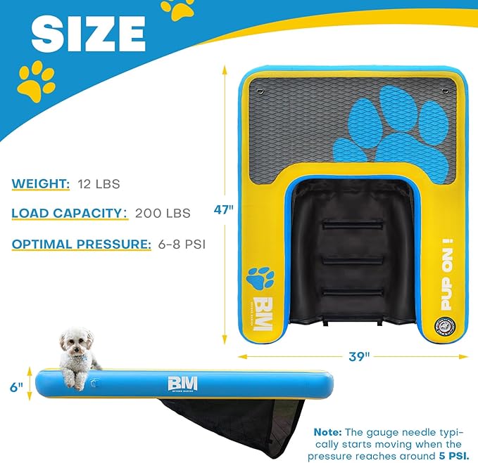 - All-in-One Package for Outdoor Fun: Your PUP ON! dog floating ramp comes complete with a hand pump, mooring ropes, storage bag, and repair kit—everything you need for hassle-free setup and water-time bonding. Whether you're looking for a pool ramp for dogs, puppy plank, or boat dog ramp, this complete set ensures your pet is ready to join every water outing