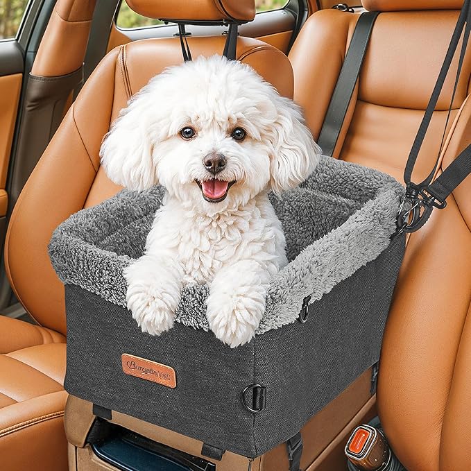 BurgeonNest Armrest Medium Sized Dog Car Seat - Portable Pet Booster Center Console Carseat Up to 15lbs, Safe Comfort Car Travel with Metal Frame, Pee Pad, Washable Fluffy Cushion and Interior, Grey