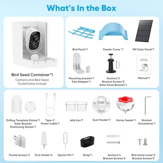 - Bird-Friendly Design Attract – More Species with Ease: The bottom tray and drainage holes prevent water buildup, keeping bird food fresh and dry. This smart bird feeder comes with fruit fork, fruit holder, hummingbird feeder, and jelly cup – perfect for offering a variety of foods to attract different bird species. Easily mount it to a wall, fence, tree, or use a pole in your yard for flexible birdwatching.