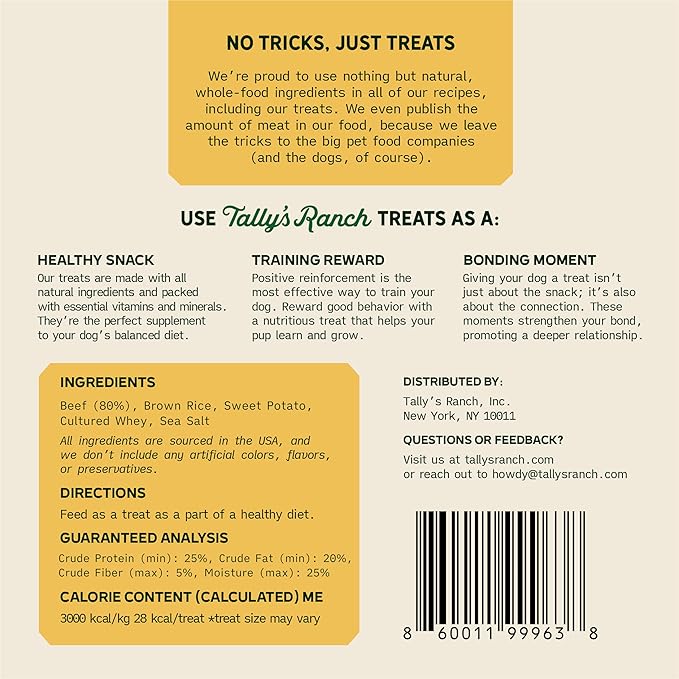 - Dog treats crafted with just 5 simple, natural ingredients—beef, brown rice, sweet potato, cultured whey, and sea salt—without any added sugar, artificial preservatives, or fillers
