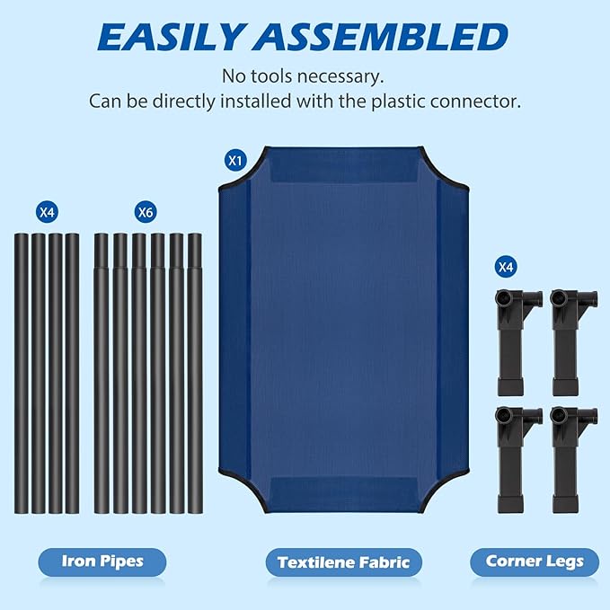 - Easy to Install: The cooling dog cot can be installed without the use of any tools, screws and can be installed directly with the plastic connector. It only takes a few minutes of your time, and presto. It's up and ready for your pet to enjoy in. Perfect for any indoor space or outdoor adventure.