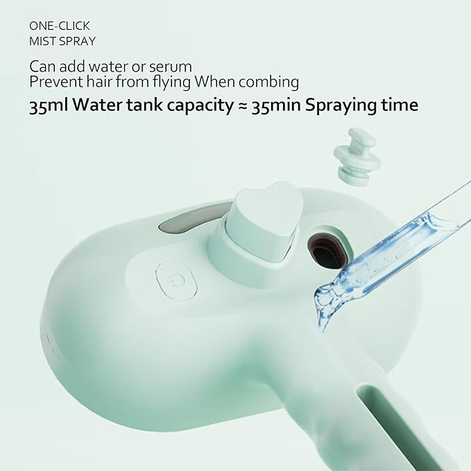 - LONG RUNNING TIME - This pet spray comb is powered by a 200mAh lithium battery, which can support 90 minutes of continuous work on a full charge. With a water tank capacity of 35ml, you can enjoy 35 minutes of spray time. Universal Type-C charging, works with any phone/tablet charger.