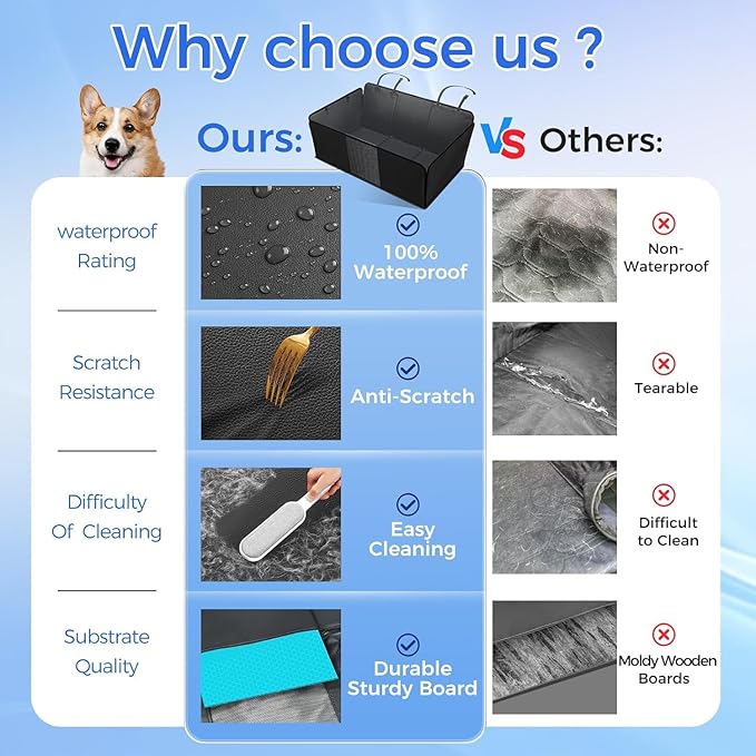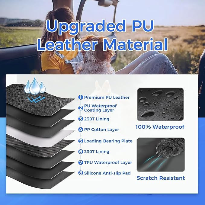 - Waterproof and Durable PU Leather:Unlike standard Oxford cloth covers, this truck back seat pet cover for dogs is made with 8 layers of premium materials. It features upgraded 100% waterproof PU leather for superior durability, anti-slip, and scratch resistance, ensuring extra safety for your dog