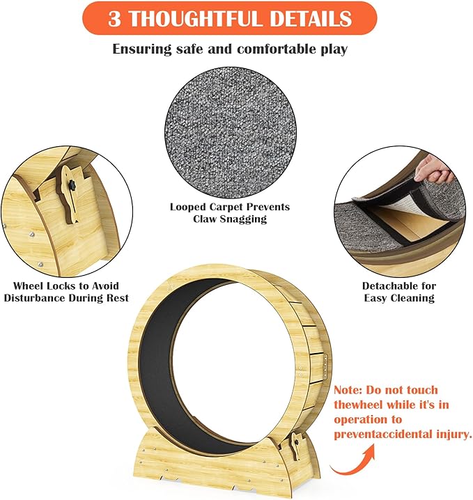 - ✅【Well-made Material & Sturdy】This cat running wheel is made of solid wood and is very sturdy. The cat wheel had maximum weight capacity 110 pounds, no need to worry about the weight of the cat at all. This treadmill wheel base is widened to completely wrap the running wheel, very stable without worrying about tipping over.