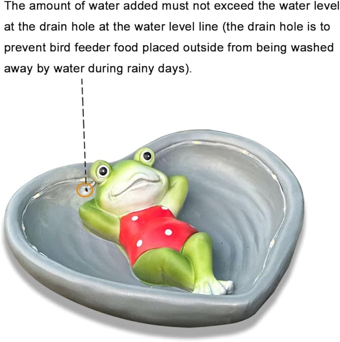 - ▶【Unique Design】Unique solar bird bath designed in the shape of a love heart, (with water leakage holes) and decorated with elegant and cute frogs, this resin bird bath can add a bright landscape to your yard.