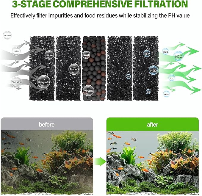 - [3-Stage Integrated Filtration] Newly upgraded filter cup with sponge, bio-filter ball and activated carbon ball, which can effectively filter out impurities and flow clean water back to the aquarium for water filtration and circulation. It is cleaner than ordinary sponge filter cups and filter bags, and can effectively filter 99% of the impurities in the water. And the filter media can be cleaned and reused again and again, keeping your fish healthy and energetic!
