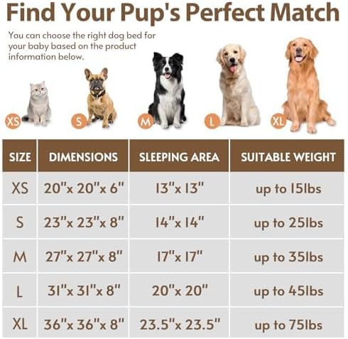 • Suitable Size: Five sizes cat and dog cushion bed are available for your choice. We recommend a 20-inch dog bed for small dogs (up to 15 pounds), a 23-inch dog round bed (up to 25 pounds), a 27-inch dog round bed (up to 35 pounds), a 31-inch dog round bed (up to 45 pounds), and a 36-inch dog calming bed (up to 75 pounds)