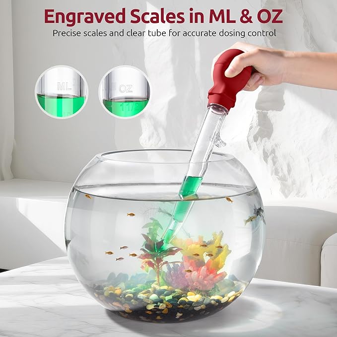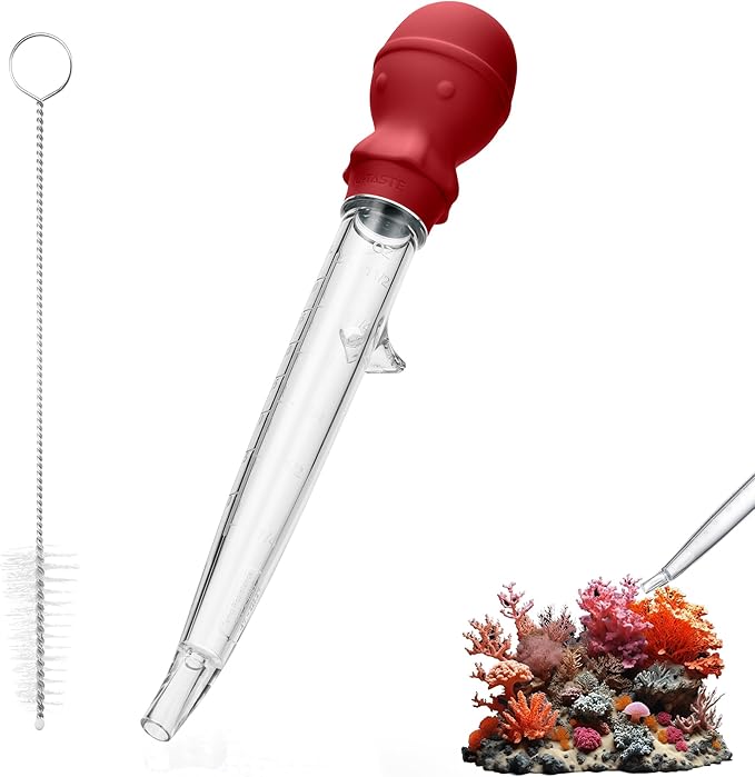 - [Precision Control & Multi-Purpose Versatility] Equipped with a heat-resistant, food-grade silicone bulb and dual ml/oz markings, this aquarium pipette cleaner delivers powerful suction for feeding corals, anemones, or bottom-feeder fish. Use it as a waste remover to take debris, or excess food, or repurpose it as a water syphon for fish tank cleaning, plant fertilization, or even kitchen tasks like grease baster. The airtight, integrated tip keep from leaks.