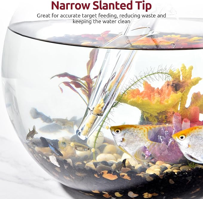 - [Food Grade Tritan Construction for Fish Tank Safety] Crafted from sturdy, transparent Tritan material, the U-Taste Aquarium Coral Feeder is food safe and shatter-resistant for fish, corals, and delicate ecosystems. With an ergonomic 11.98-inch/30.44cm length and a leak-proof, tilt-tip design, it easily targets small tanks and hard-to-reach areas. The included stand avoid spills, while the silicone suction bulb offers precise feeding control and accommodates 1.5oz of liquid.
