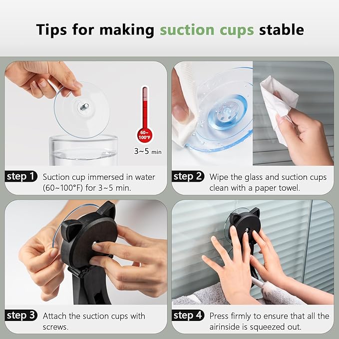 - [Pre-Installation Tips] To ensure the suction cups stick firmly to the window, soak them in hot water for 3 minutes to soften them. Dry them until they are just slightly damp, and clean the window. Apply the suction cups to the window and press firmly to squeeze the air.