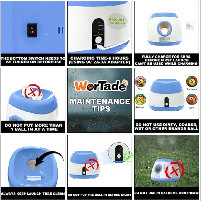 - ⚠️ Note: It is recommended to use a 9V2A (18W) charger to charge the automatic dog ball launcher. Please read the instruction manual thoroughly before use. This ball thrower for dogs is recommended for use in open outdoor areas. In addition, we do not recommend this ball toss machine for timid dogs to prevent them from being frightened. If you need any assistance or have any questions during use, please feel free to contact us, and we will provide satisfactory solutions in a timely manner.