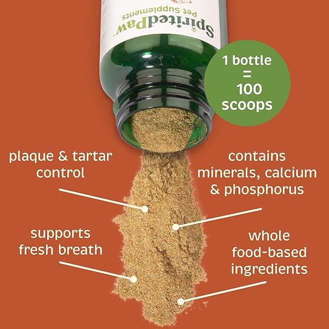 - Dental Health for Cats & Dogs: The teeth support powder is enriched with calcium, manganese, and organic kelp to help reduce plaque and tartar buildup, promoting fresh breath and a healthy mouth.