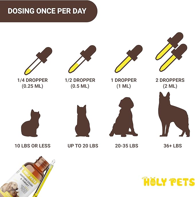- SIMPLE AND CONVENIENT DOSAGE: Just add to your pet’s food or water once or twice daily. For small pets (up to 20 lbs), use ½ drop; for pets between 20-35 lbs, use 1 drop; for larger pets (36 lbs and up), use 2 drops. The liquid formula is tasteless, free of chemicals, and easy to administer, making it a great alternative to pills, syrups, or chewables