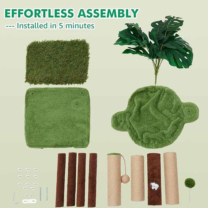 - 【Home Decoration with Green Plant Elements】The vivid green leaves and the color of the cat bed create an immersive jungle atmosphere that seamlessly blends with home decoration, while also stimulating the cat's natural curiosity. It integrates functions such as sleeping, playing, lounging, frolicking, and scratching, taking into account both aesthetics and practicality. Bring nature indoors with our eco-chic cat tree.