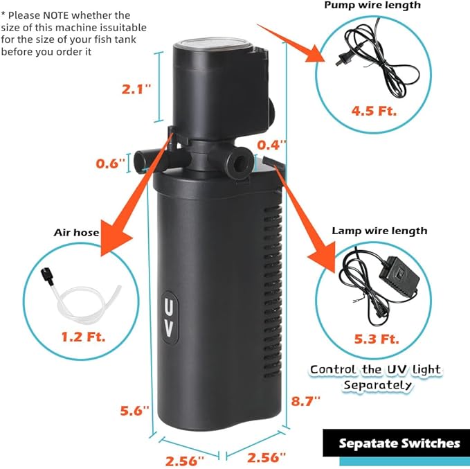 - SEPARATE SWITCHES - Control the water pump and fish tank light separately. When you only want to use the aquarium filter function, you can turn off the fish tank U-V light separately