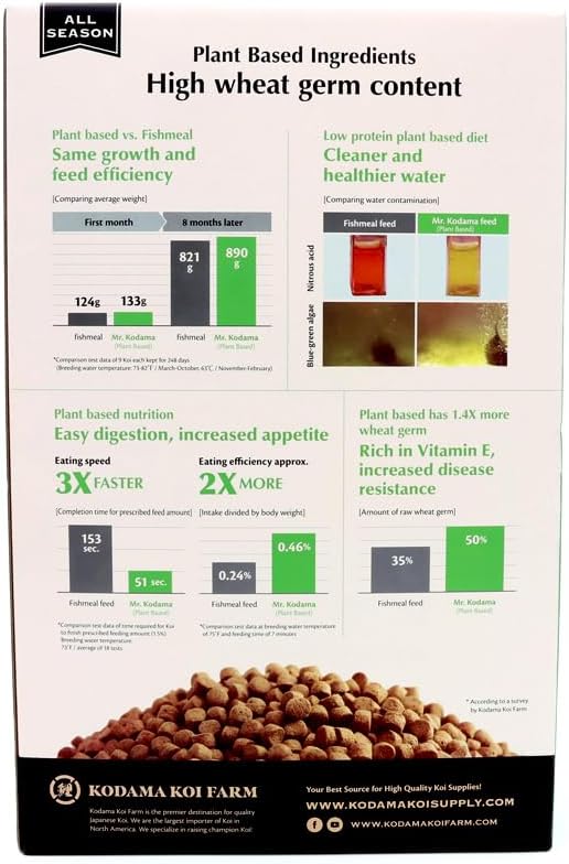 - INCREASED DISEASE RESISTANCE: Made with highly nutritional wheat germ rich in Vitamin E, Mr. Kodama Plat Based Koi Food helps koi mount a stronger immune response against various pathogens, including bacteria, viruses, and parasites.