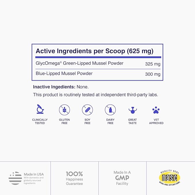- FOR ALL AGES, SIZES & BREEDS: Our green-lipped mussel for dogs is perfect for all breeds, sizes and ages. Our easy to use green lipped mussel powder for dogs can be put in food or kibble. This delicious daily green lipped mussels for dogs is perfect to support overall joint mobility and flexibility. Unlike other new Zealand green lipped mussel for dogs, we combine powerful blue lipped mussel with GlycOmega green-lipped mussel powder to support hip and joint health.