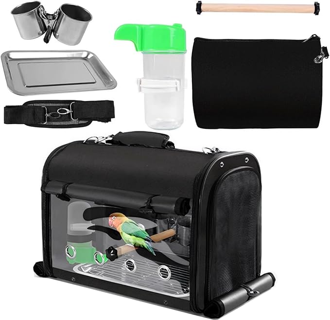 - [Bird Travel Cage with Full Set] There are two bowls, one water bottle, two perches in diferent sizes, one shoulder strap and an small bag for extra storage come with Sanmoncare bird carrier which provide a comprehensive care and comfortable environment for birds in travel.